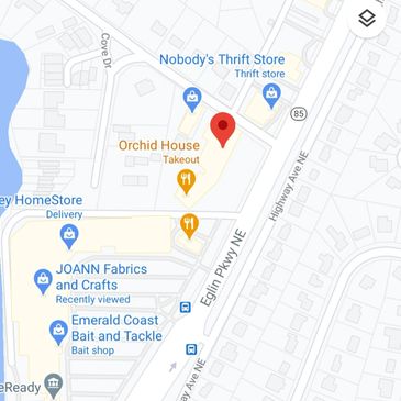 We are located on Eglin Pkwy close to the Cinco Bayou Bridge. Some of the stores nearby include JoAnns Fabrics, Dollar Tree and Sherwin Williams! Our address is 248 Eglin Pkwy NE unit A